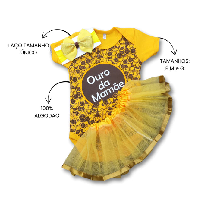 Body Bebê Mesversário com Tule e Laço 100% Algodão – Kit 3 Peças Temático Ouro da Mamãe