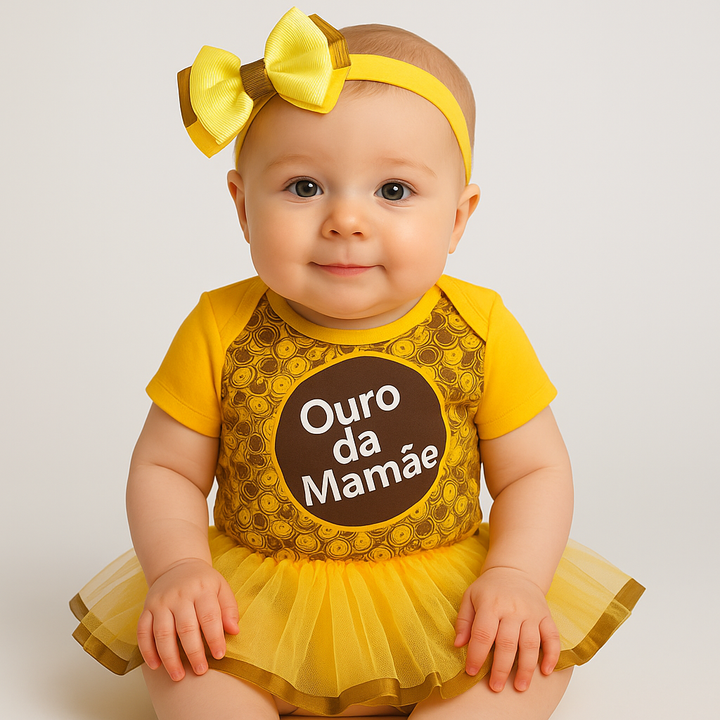 O Body Bebê Mesversário com Tule e Laço 100% Algodão – Kit 3 Peças Temático Ouro da Mamãe é inspirado na doçura e no brilho especial que toda mamãe enxerga no seu bebê. Produzido em 100% algodão, garante conforto e suavidade, enquanto o tule e o laço deixam o look ainda mais elegante e encantador para mesversários, festas e ensaios fotográficos.